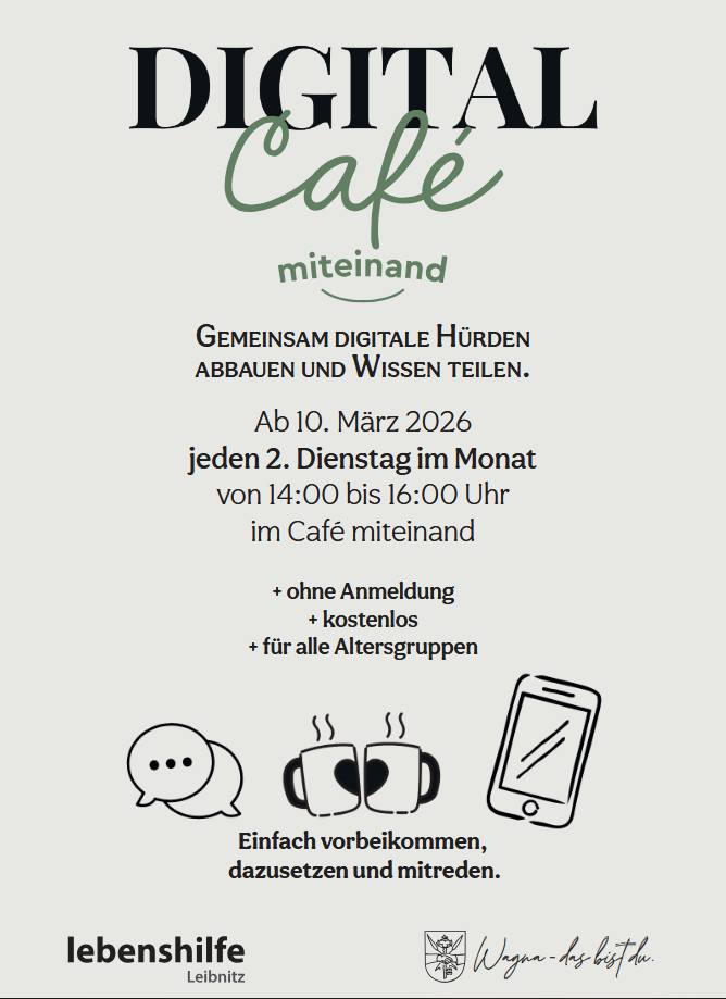 Gemeinsam mit der Marktgemeinde Wagna und ihrem Digitalmanager Ferdinand Weber arbeiten wir an einem neuen Projekt: dem „Digitalcafé“. In entspannter Café-Atmosphäre bietet unser Team der Lebenshilfe die Möglichkeit, sich mit interessierten Besuchern auszutauschen. Dabei stehen Themen wie die Nutzung von Smartphones, Apps und auch ID Austria im Mittelpunkt. Alle Interessierten sind herzlich eingeladen, vorbeizukommen, miteinander zu sprechen und voneinander zu lernen.